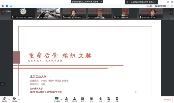 11月18日晚,作为“2022(第六届)北京国际城市设计大会”的重要平行学术活动,由中国建筑学会城市设计分会、北京市规划和自然资源委员会西城分局、北京未来城市设计高精尖创新中心、威廉体育williamhill联合主办的“威廉希尔体育2022年六校联合城市设计工作营”答辩会,在西城区赵登禹路42号北京老城保护更新基地线下和腾讯会议同步举行。