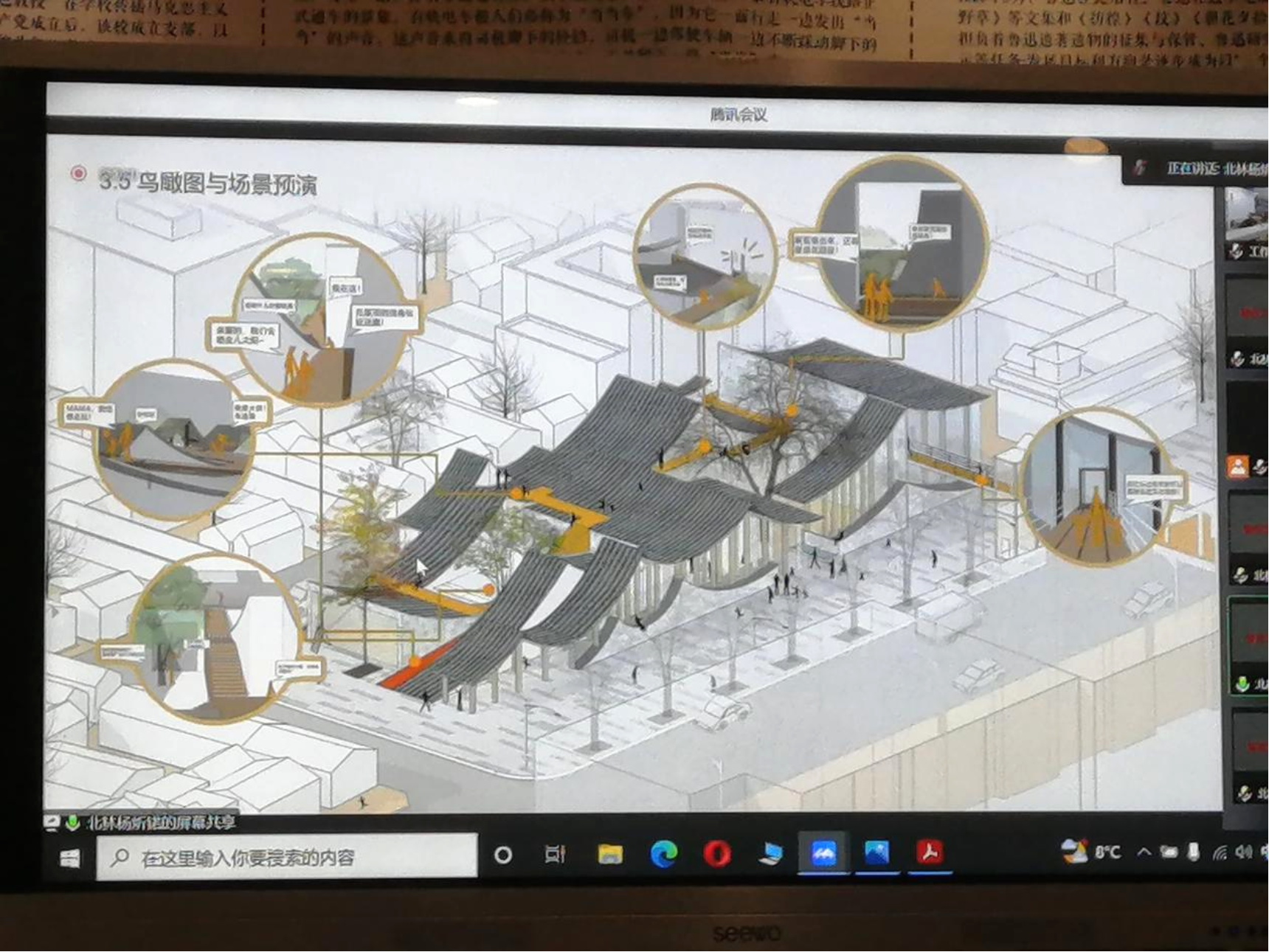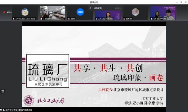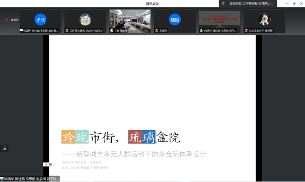 然后是进入答辩环节。答辩会采用抽签的方式确定了各校团队的答辩顺序。在汇报环节中,北京工业大学团队以“重塑后堂,续织文脉”为题,引入“后堂”理念,通过对周边环境的分析,推导建筑形态的生成。清华大学团队以“玲珑市街,琉璃合院”为题,通过历史脉络的分析,制定自上而下的更新策略,探讨新型城市多元人群活动下的多合院体系设计。北京林业大学团队以“瓦浪如海”为题展开设计,强化天桥与建筑的连接,营造趣味性和诗意性的游园空间。威廉希尔体育团队以“织补城市,重塑活力”为题,呼应历史街区尺度,织补城市肌理,依据城市发展与居民日常需求,植入复合功能。北方工业大学团队以“共享·共生·共创 琉璃印象·画卷”为题,从联系道路、新型业态、共享空间三方面策略入手,设计文化艺术交流中心。中央美术学院团队则以“隐于市,市于隐”为题,以建筑公共性为线索,探讨了与市井活动场景相结合的文化市集设计。与会评委专家老师对各校的成果进行了精彩的点评。
