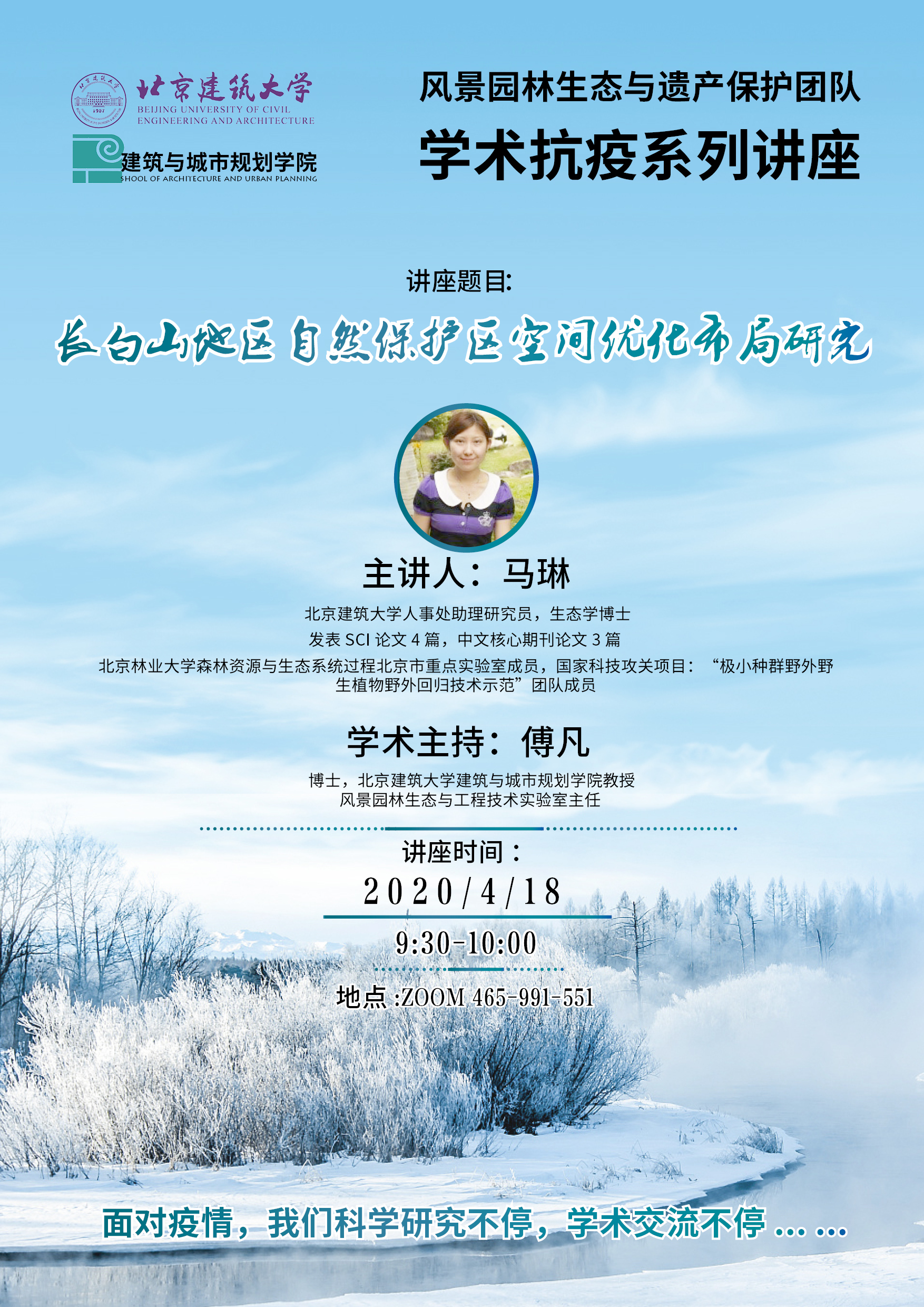 4月18日上午,北京林业大学森林资源与生态系统过程北京市重点实验室成员,威廉希尔体育人事处助理研究员马琳博士应邀在ZOOM平台上以“长白山地区自然保护区空间优化布局研究”为主题展开分享,公司师生和校外学者共40余人参与本次线上学术交流活动。