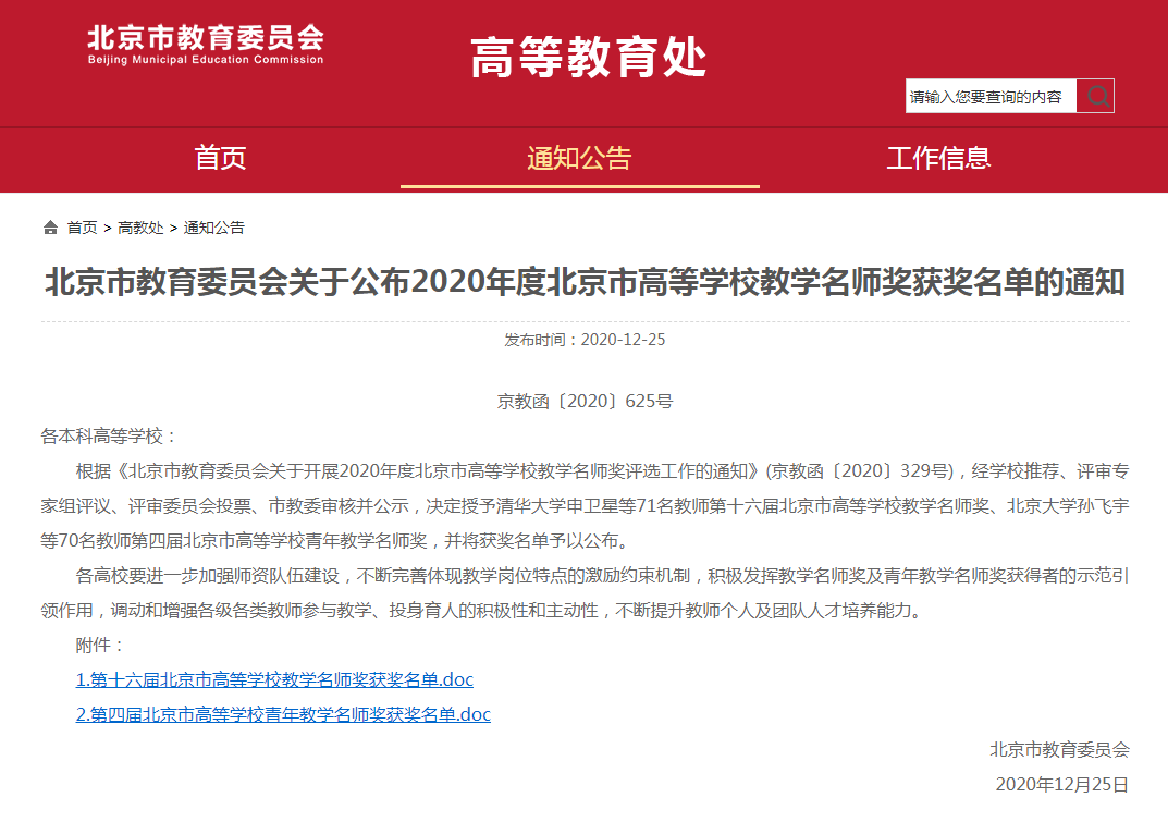 北京市高等学校教学名师奖评选由北京市教委主办,旨在深入贯彻落实全国、全市教育大会精神,发挥教学名师的示范榜样作用,深化公司产品改革,促进高等教育内涵发展。威廉体育williamhill将进一步总结经验,凝练优势,充分发挥青年教学名师的示范引领作用,引导、激励广大教师更加积极投身本科教学,实现“名师”与“金课”的互促、共建、共强。