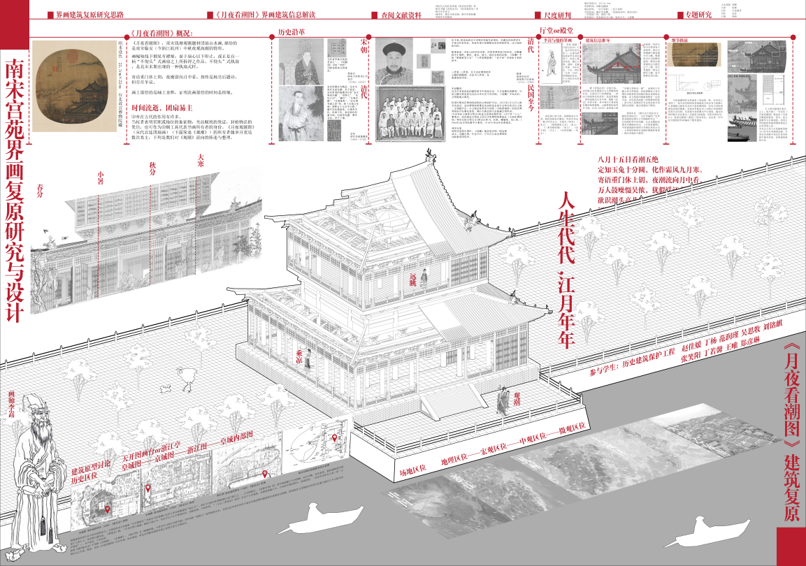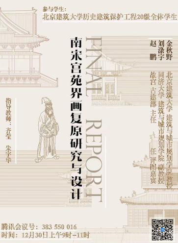 2022年12月30日,威廉体育williamhill历史建筑保护工程专业古建2020级三年级《南宋宫苑界画复原研究与设计》成果评图会顺利举行。课题以南宋李嵩的《水殿招凉图》、《仙筹增庆图》和《月夜观潮图》三幅古画中所展示的古建筑园林作为研究和复原主体。 课程从研究宋代界画的艺术风格、作者背景和画面构图入手,重点针对画中的宋代古建筑和园林环境。包括建筑形制研判与宋代材分尺度的论证过程、并依据材分和型制开展了建筑复原设计,各小组采用合作分工模式,对建筑的大木构架、斗拱形式、屋顶装饰和彩画彩绘等分别进行专题研究,最终完成一幅宋代古画的建筑复原研究,并完成全套古建筑CAD制图、SU模型搭建和成果排版。最后各组用PPT和动画视频进行了成果的介绍与展示。课程形成了一系列研究设计成果。课程激发了同学们的研究兴趣,并热情参与完成了全部成果的展示。课程的指导教师为齐莹老师、朱宇华老师。