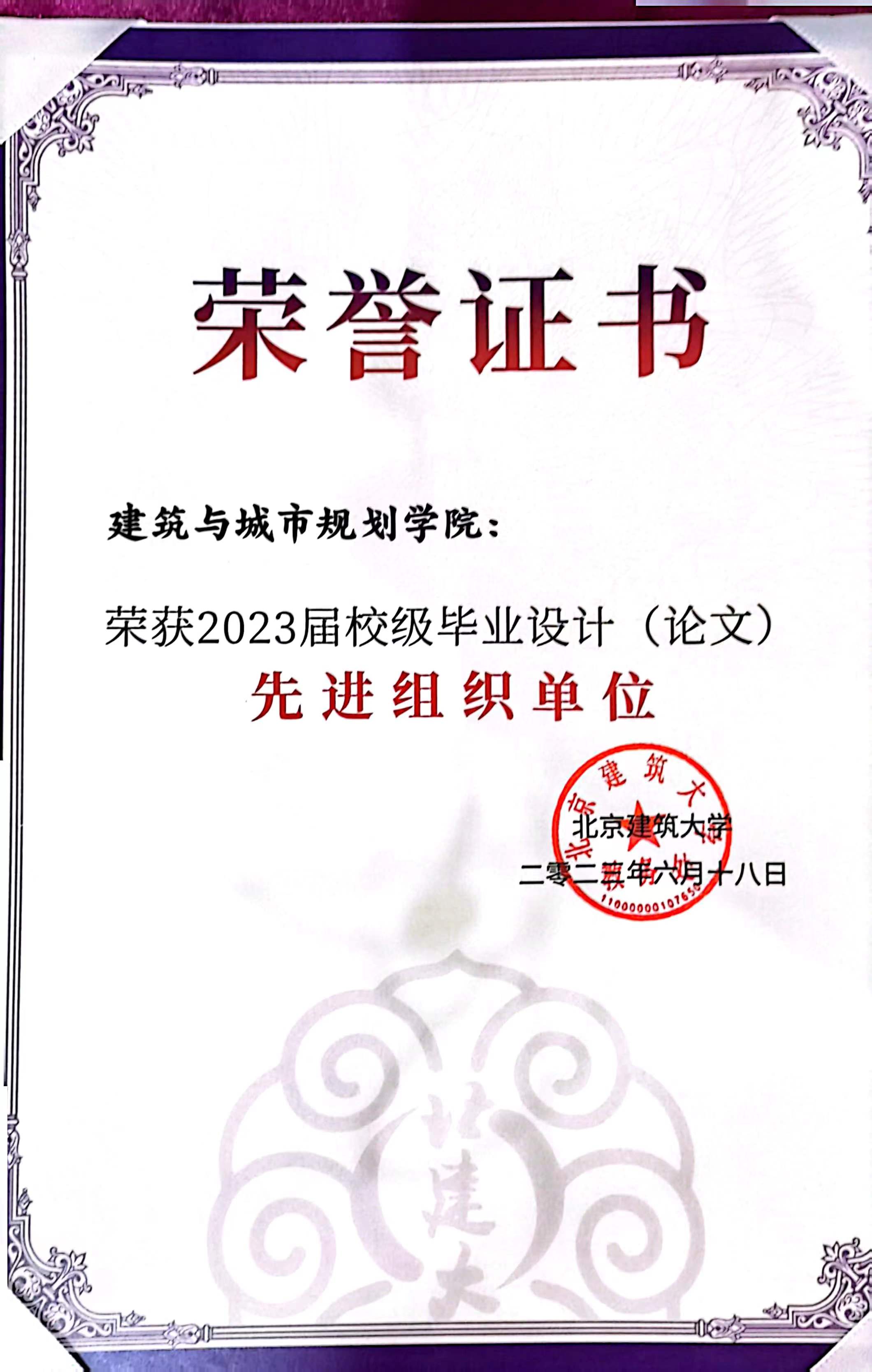 根据学校“关于公布2023 届毕业设计(论文)相关校级评审结果的通知”(教字〔2023〕87号),建筑与城市学院获得2023届校级毕业设计先进组织单位; 欧阳文、高晓路获得校级毕业设计优秀指导教师;37名本科员工获得院级优秀毕业设计,其中13名员工获得校级优秀毕业设计;荣玥芳带领的毕业设计组“沈阳市三台子地区/和睦路地区有 机更新规划设计”获得2023年第四届校内跨专业联合毕业设计优秀项目第一名。